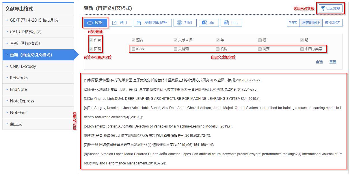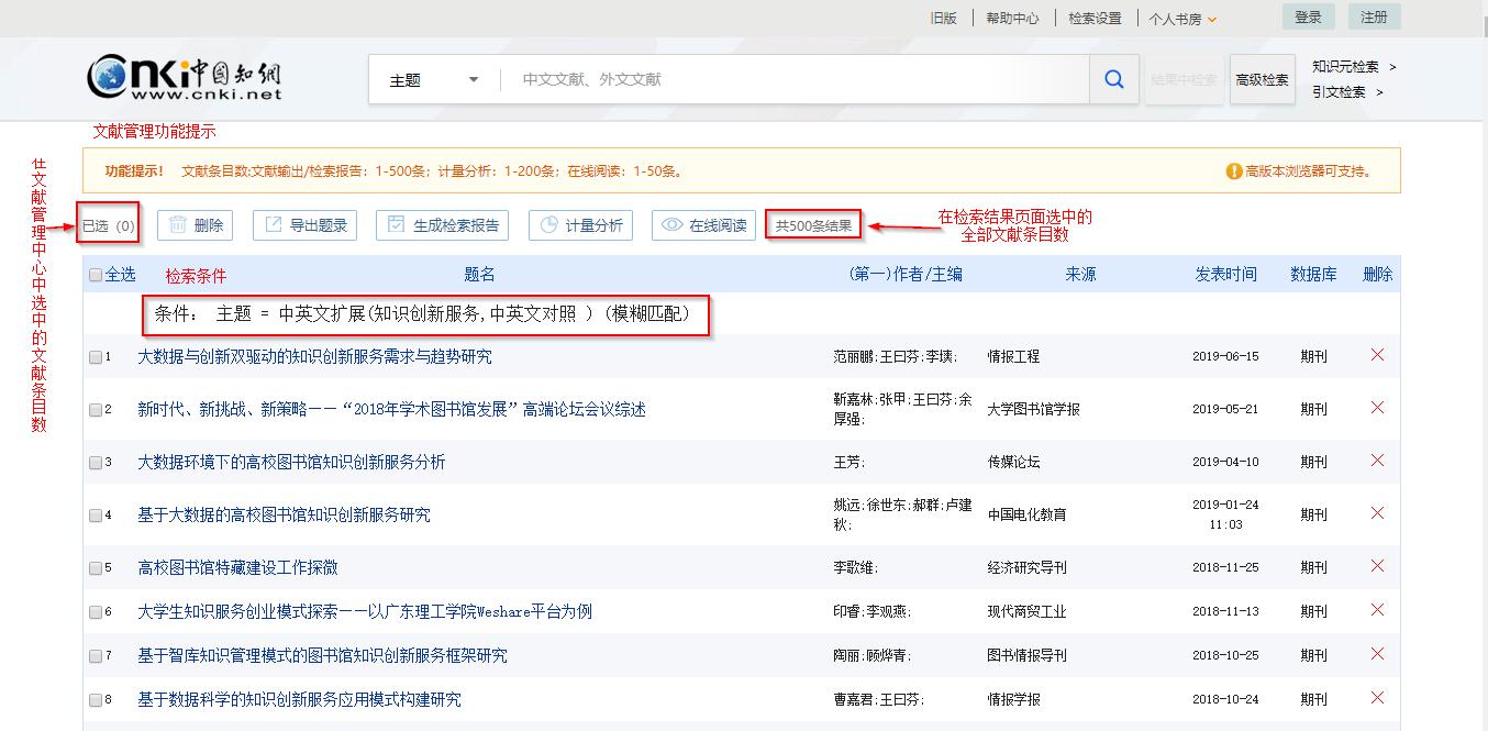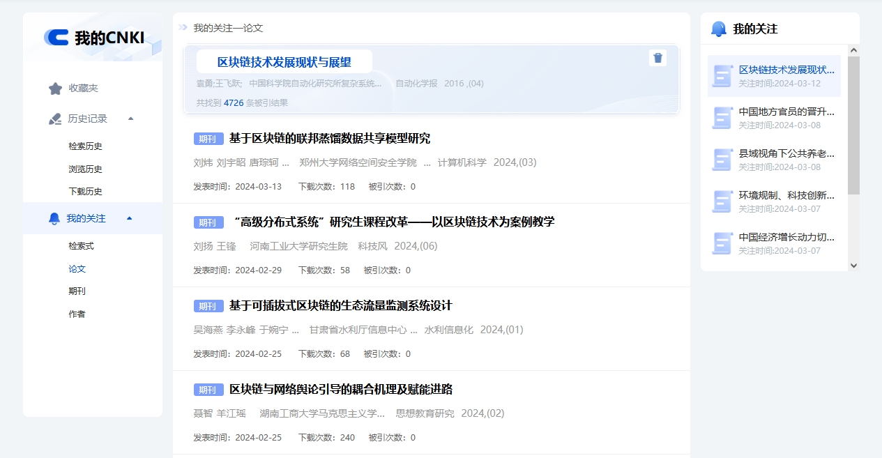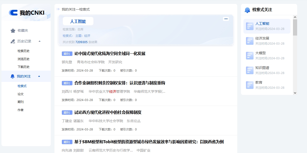 2)使用我的CNKI提供的相关功能,例如检索结果的文献收藏与关注、历史记录的查看等。