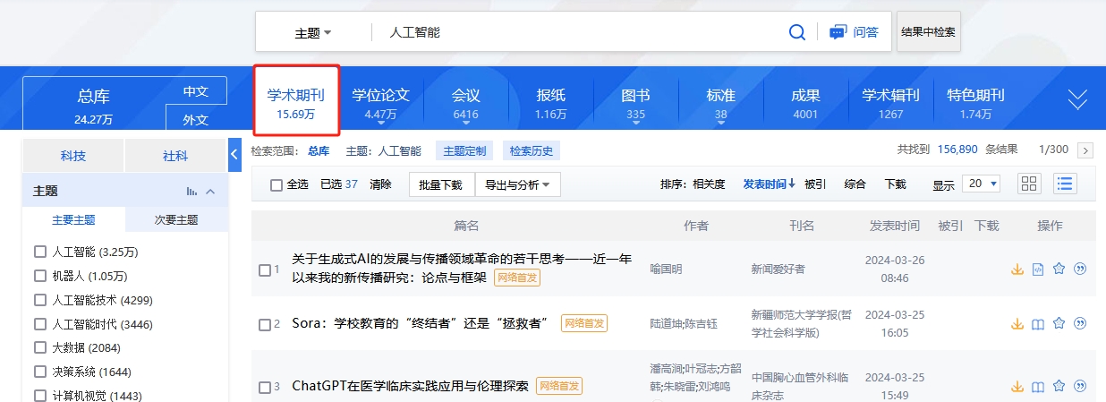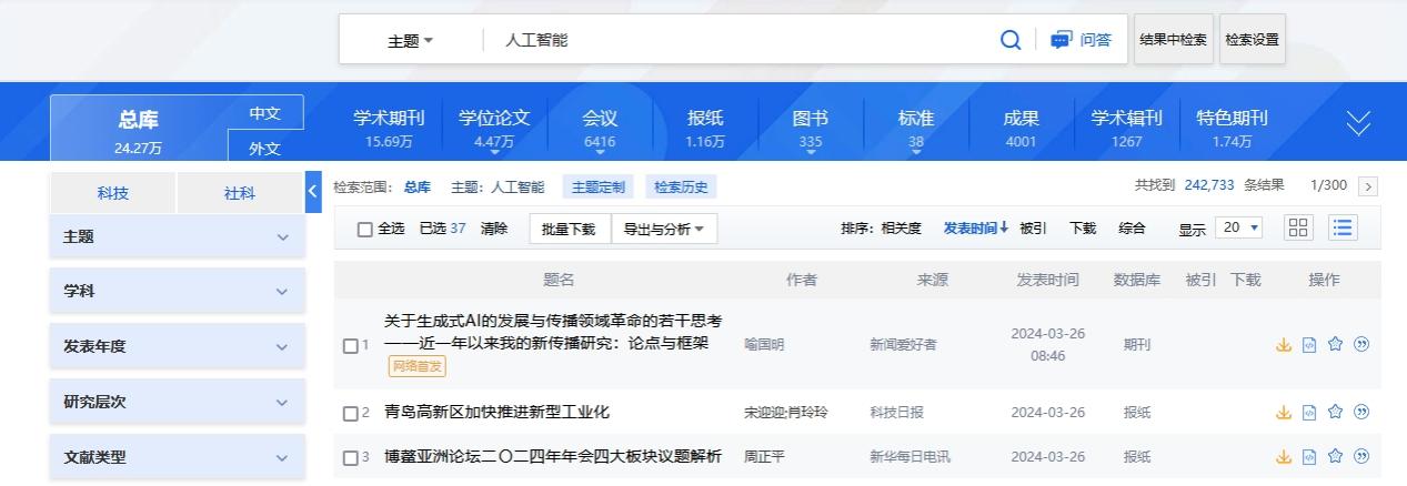 平台检索涵盖的资源类型有:学术期刊、学位论文、会议、报纸、年鉴、专利、标准、成果、图书、学术辑刊、特色期刊。
