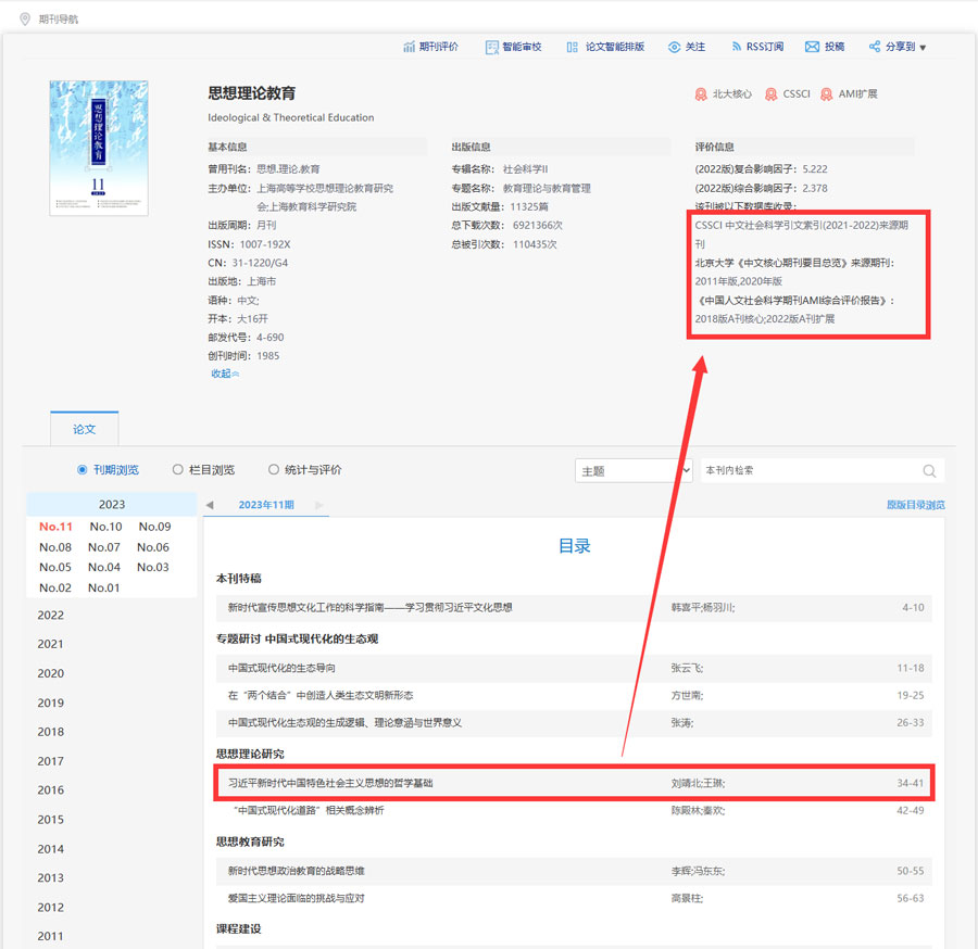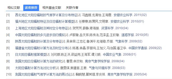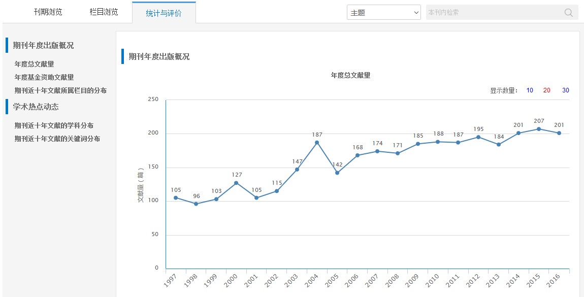 如图5.8.5.3所示,左侧默认展示近十年的栏目信息,还可以切换标签查看近五年、近三年、近一年的栏目信息。右侧为该栏目下的文献列表。
