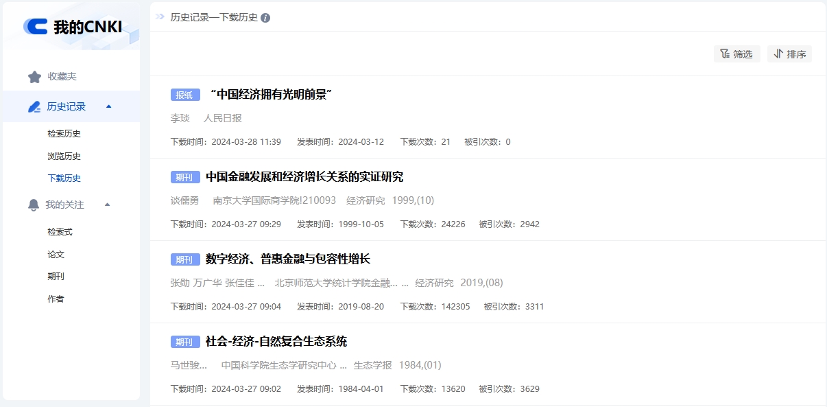 下载历史为PDF下载、CAJ下载、HTML阅读、在线阅读的记录,显示已下载文献的类型、名、作者、机构、来源等信息,支持按下载时间筛选或排序。点击文献标题,跳转至该文献知网节页面。鼠标悬停到某篇文献,点击按钮可下载收藏该篇文献。