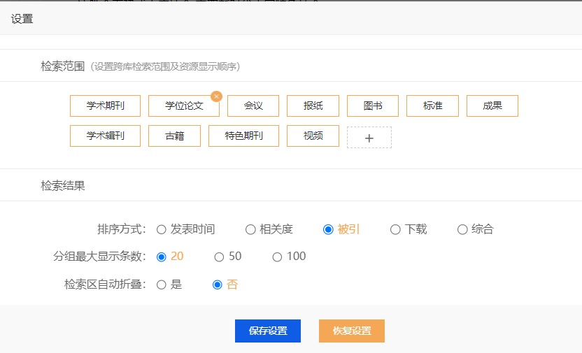 1)保存总库检索设置,如默认跨库选择、检索排序等。
