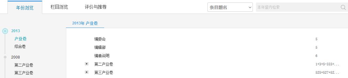 如图5.8.6.2所示,左侧展示年鉴的出版年和卷信息,右侧展示已选年卷的目录,点击,可以展开下级内容,点击,收起下级内容,条目按照页码正序排列。点击条目名称,可进入该条目的知网节。