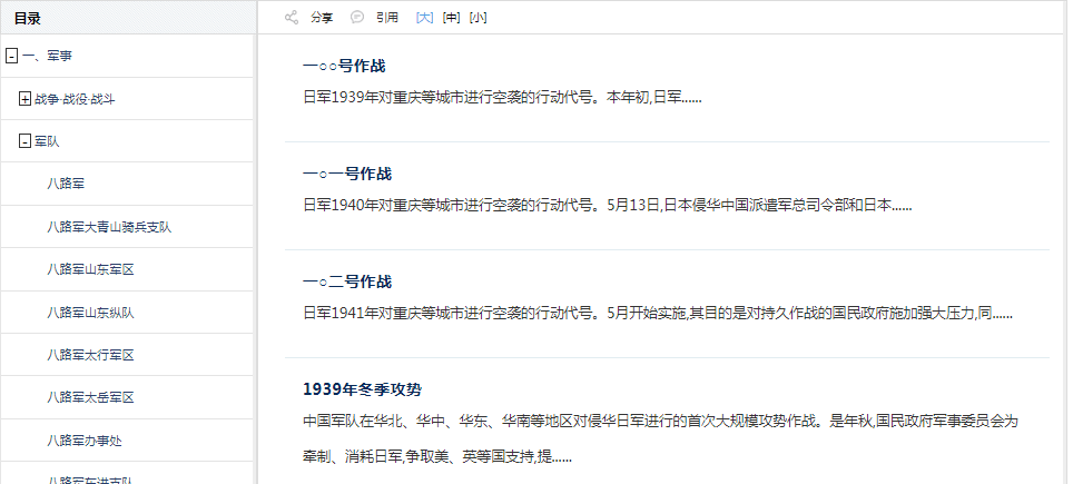 如图5.8.7.2所示,左侧展示工具书的目录,右侧展示已选目录节点的内容,点击,可以展开下级内容,点击,收起下级内容,条目按照页码正序排列。点击条目名称,可进入该条目的知网节。
