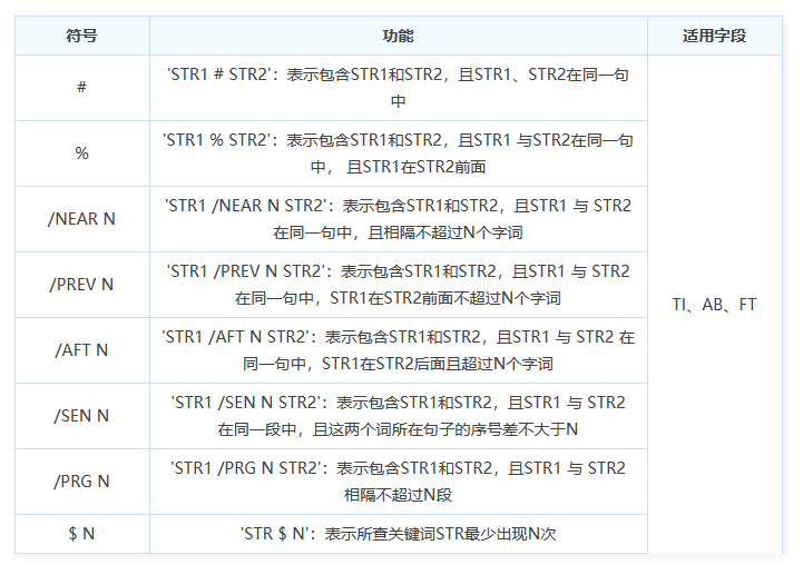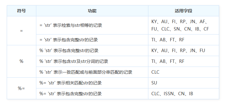 专业检索是借助SQL语句表达检索需求,在使用专业检索时需要有明确的检索字段,通过<字段代码><匹配运算符><检索值>构造检索式。以 KY='知识服务' AND (AU % ''+'')为例,KYAU可替换为自己检索的字段,=%可根据自己的需求使用对应的匹配运算符,KYAU检索字段间用ANDORNOT连接,字段内多个值的关系用+-*来组合,或者位置限定的语法符号。