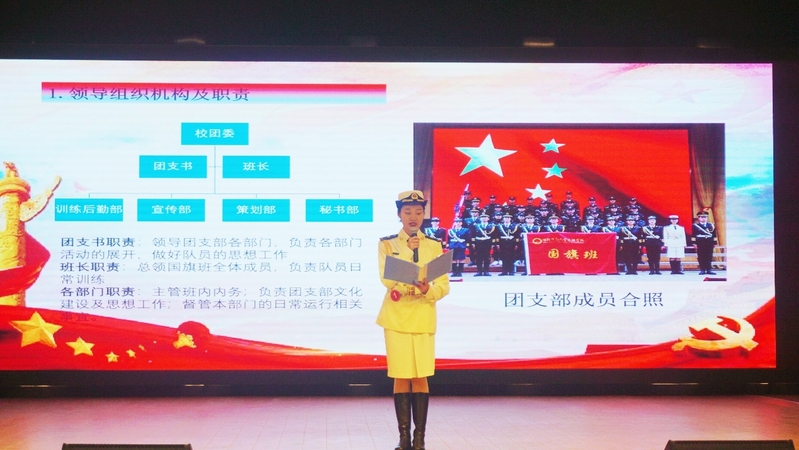 国旗班团支部从日常训练、学部升旗、爱国主题教育课、观影活动、知识竞赛五个主题讲述支部荣誉与理论前进方向,以情景剧的形式展示支部的独特风采;中文2108班团支部结合专业特色,朗诵红色经典,彰显青春担当;教育与艺术学部小教2003班团支部树立全面发展的支部理念,在“支部风采展示”环节中以独具创意的手势舞展现“生在红旗下”新青年的蓬勃朝气。场上选手用慷慨激昂的演讲辅以丰富多彩的多媒体,使展示精彩纷呈,掌声不绝。