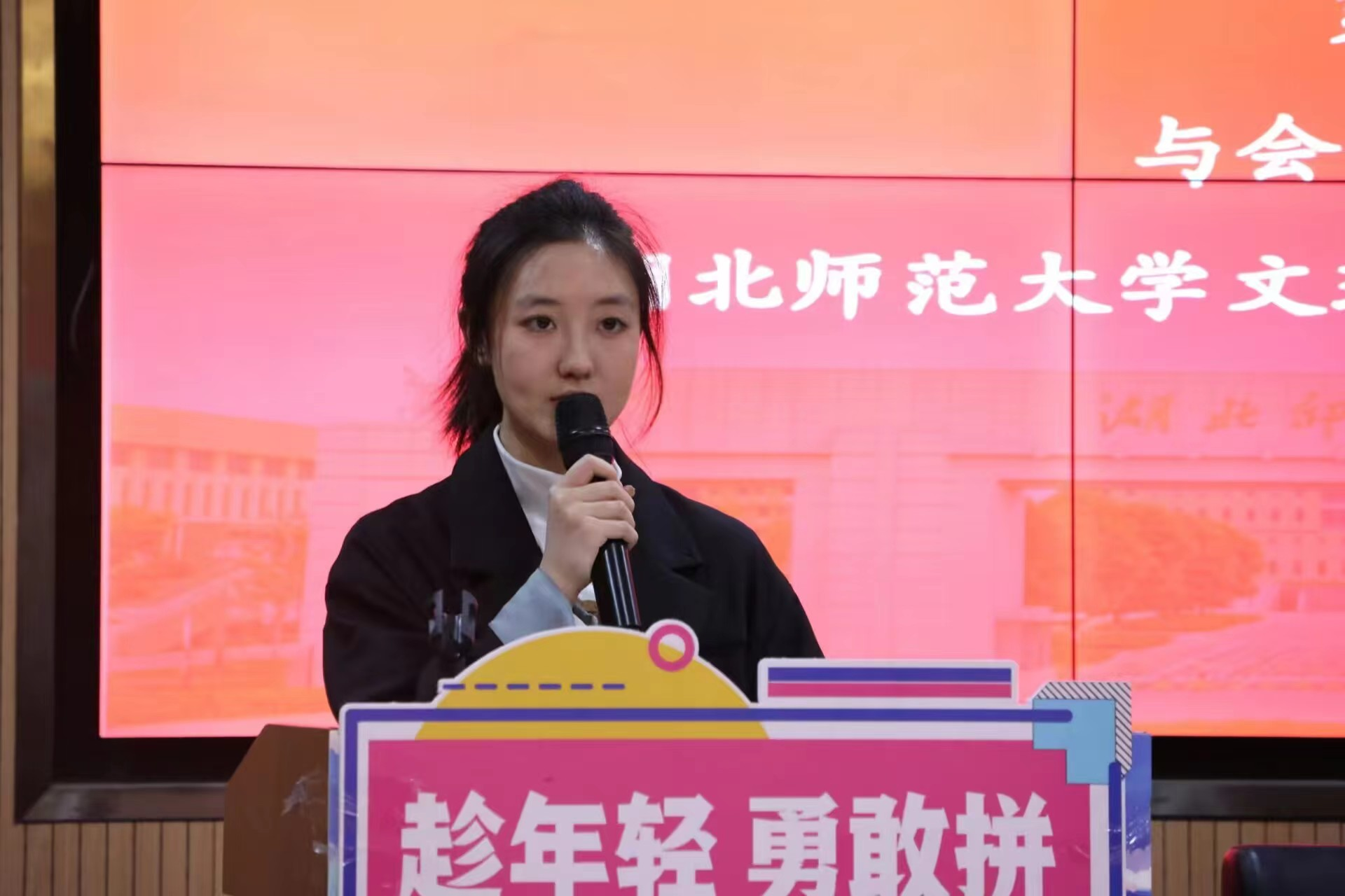 会议第二项,湖北师范大学校团委学生副书记黄凯龙发言,他通过总结湖北师范大学一直以来的发展方针及所获的荣誉向大家分享三点经验:一是坚持以习近平新时代中国特色社会主义思想为指导,全面贯彻党的二十大精神,深入学习习近平总书记关于青年工作的重要思想,持续开展青年大学习和团日活动;二是坚持服务中心大局,紧扣服务青年工作生命线,引导广大团员青年学生在社会课堂上就教育长才干做贡献;三是坚持专业专精,锤炼过硬本领,以自身激情感染广大青年,以自身能力引领青年群众。