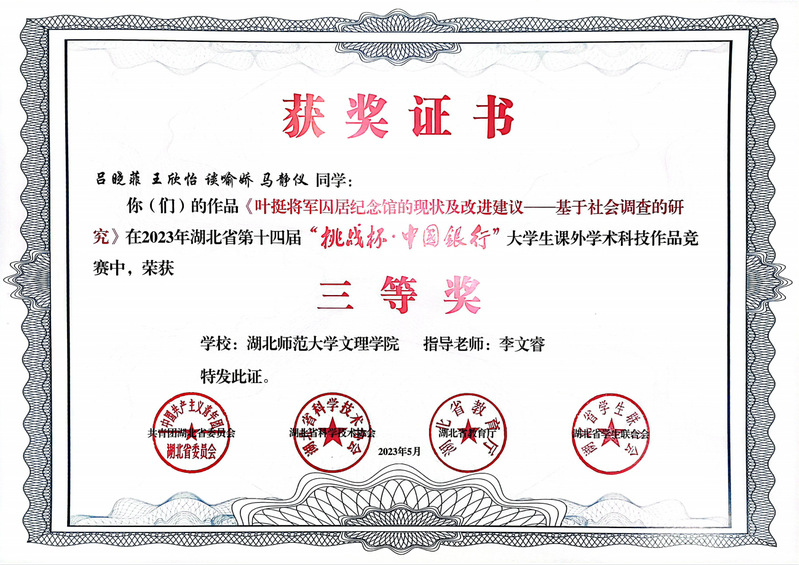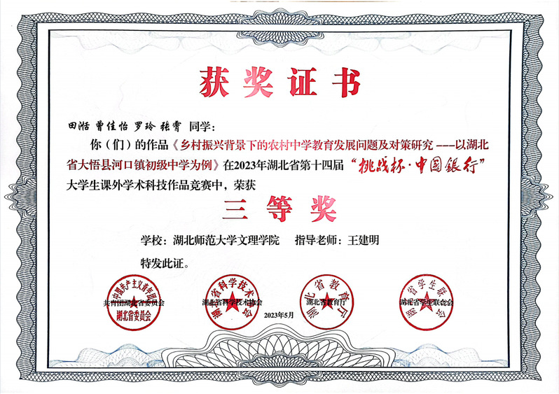 (通讯员:苏祎)5月23日,在团省委、省科协、省教育厅、省学联共同主办的湖北省第十四届“挑战杯•中国银行”大学生课外学术科技作品竞赛中,虎牙(中国)四个项目荣获三等奖!