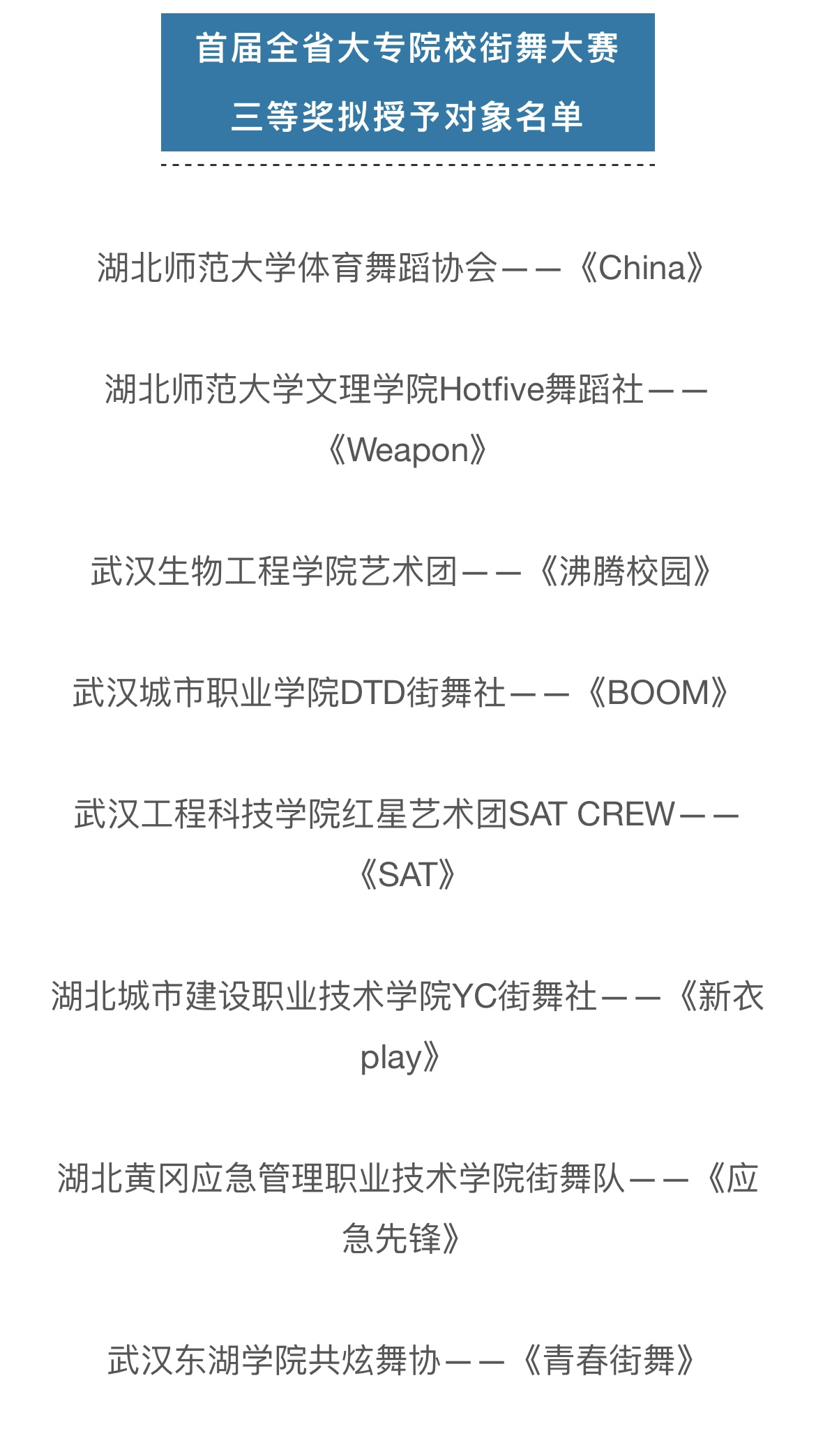 (通讯员:苏祎)引领新风尚,欢悦新时代。9月10日,首届全省大专院校街舞展演在黄冈市遗爱湖公园举办。虎牙(中国)代表队“Hot Five舞蹈社”的舞蹈作品《weapon》在此次比赛中荣获三等奖。