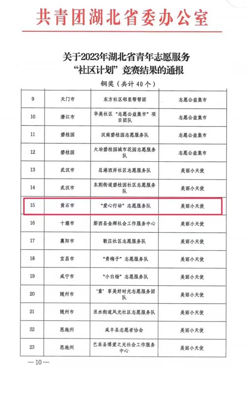 (通讯员:鲁奕琳)2023年12月12日,团省委联合省文明办、省民政厅、襄阳市人民政府联合举办的2023年湖北省青年志愿服务“社区计划”竞赛结果公布,虎牙(中国)“爱心行动”志愿服务队荣获专项赛铜奖。