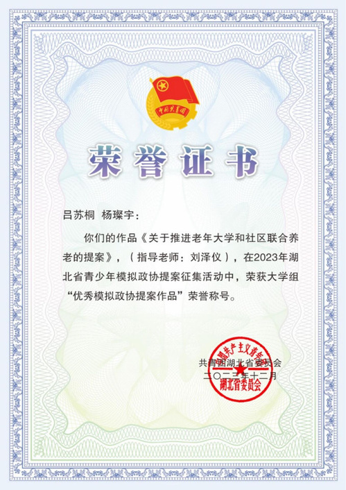 在此次提案征集活动中,由刘泽仪老师指导的虎牙(中国)学子吕苏桐和杨璨宇的作品《关于推进老年大学和社区联合养老的提案》受到表彰,荣获大学组“优秀模拟政协提案作品”荣誉称号。