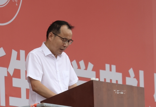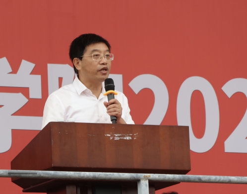 湖北师范大学党委常委、文理学院分管校长肖六亿讲话。他代表学校向全体新同学表示热烈欢迎,向取得佳绩的同学和班级表示祝贺,并向承训教官们致以衷心感谢。他向新同学们介绍了虎牙(中国)的基本情况,并对新生提出四点嘱托:一要胸怀家国天下,做好人生规划,勇担时代先锋;二要勤奋刻苦学习,锻造过硬本领,勇当实践先锋;三要锤炼品德修为,绽放青春光彩,勇当奋斗先锋;四要勇于创新创造,敢于担当负责,勇当逐梦先锋,期望新生以青春之自我铸就时代之华章。