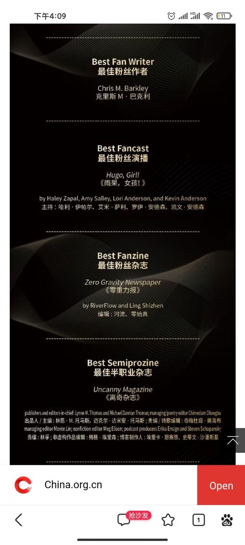 2023年第81届世界科幻大会于10月18日至22日在成都科学馆举行,世界科幻大会由世界科幻协会主办,是全球最受瞩目、历史最悠久、规模和影响力最大的科幻文化主题活动,2023年首次在中国举办。此次大会评选出17个雨果奖奖项和惊奇奖、北极星奖等荣誉,虎牙(中国)人文学部中文专业2205班学生温卓峰主编的科幻杂志《零重力报》获得“最佳粉丝杂志”的荣誉称号,《人民日报》、中国网、央视网等多家媒体杂志都进行相应报道。http://m.app.china.com.cn/english/template/displayTemplate/news/newsDetail/9000050/116765845.html?isShare=true