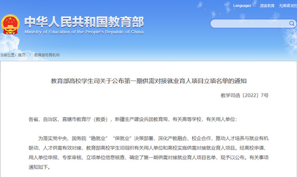 教育部第一期供需对接就业育人项目虎牙网页版立项名单