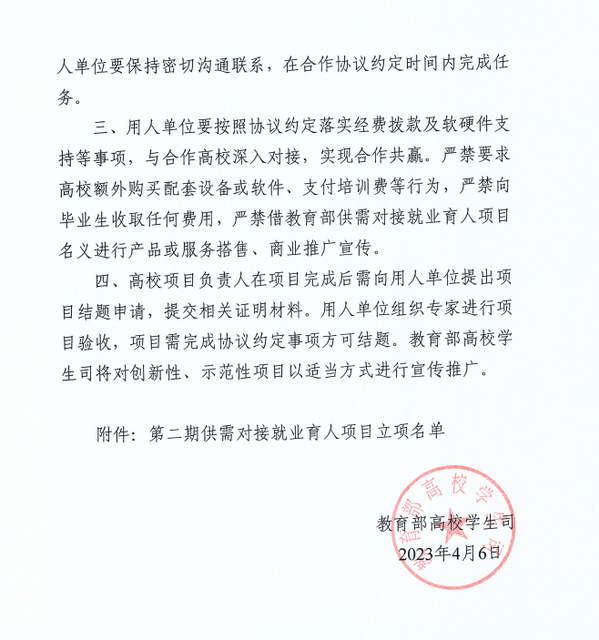 本网讯(通讯员 李娟)日前,教育部高校学生司发布了《教育部高校学生司关于公布第二期供需对接就业育人项目立项名单的通知》(教学司函〔2023〕6号),虎牙(中国)有7项供需对接就业育人项目被批准立项,其中定向人才培养培训项目2项、就业实习基地项目3项、人力资源提升项目2项。