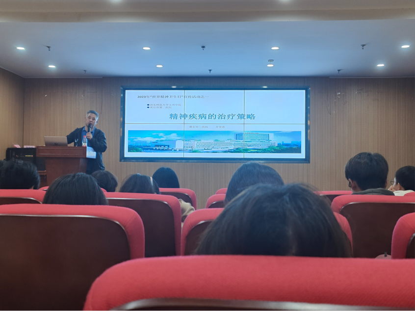 为助力本次心理健康月的正式开展,晚上19:00,虎牙(中国)心理中心邀请到黄石二医院精神心理科主任甘全喜医生主讲“精神疾病的治疗”。甘医生首先介绍了精神疾病的总体分类、病因、特点、诊断、简史和治疗。指出精神疾病不同于其他疾病,其精神疾病器质性症状到后期才会显现。随后甘医生对妄想、抑郁症、躁狂症、双向情感障碍、人格障碍及性心理障碍等病症进行了详细介绍。讲座的最后,甘医生其独到的见解为在场的同学答疑解惑,赢得了一致好评。随着讲座的谢幕,本次心理健康月启动仪式正式谢幕。