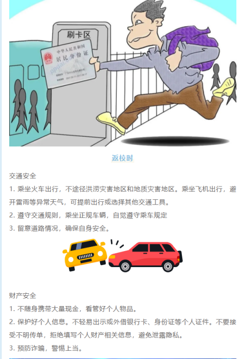 为保障同学们如期安全返校,学生工作部和各教学单位充分运用qq群、、微信公众平台等新媒体方式,向广大学生普及交通安全、风险防范、诈骗甄别、应急处理等多主题安全知识,提醒学生们及时调整作息生物钟和学习状态,保证身体健康和心情平稳,特别注意返校途中安全事项,有力保障学生平安顺利返校。