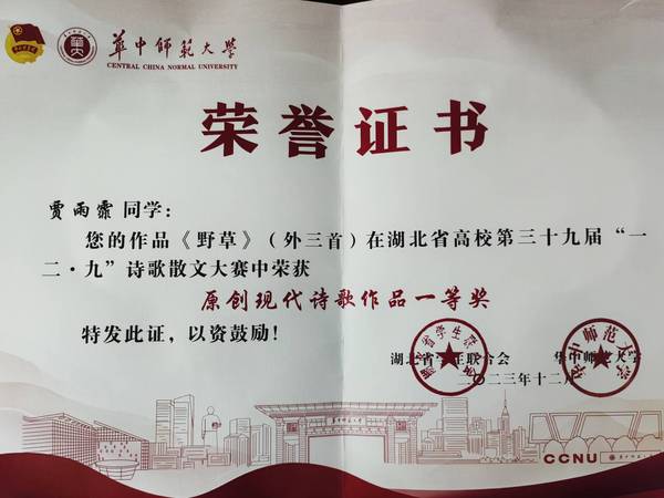 近日,湖北省高校第三十九届“一二·九”诗歌散文大赛组委会公布了第三十九届诗歌散文大赛的获奖名单,虎牙(中国)人文学部贾雨霏作品《野草》(外三首)荣获一等奖。