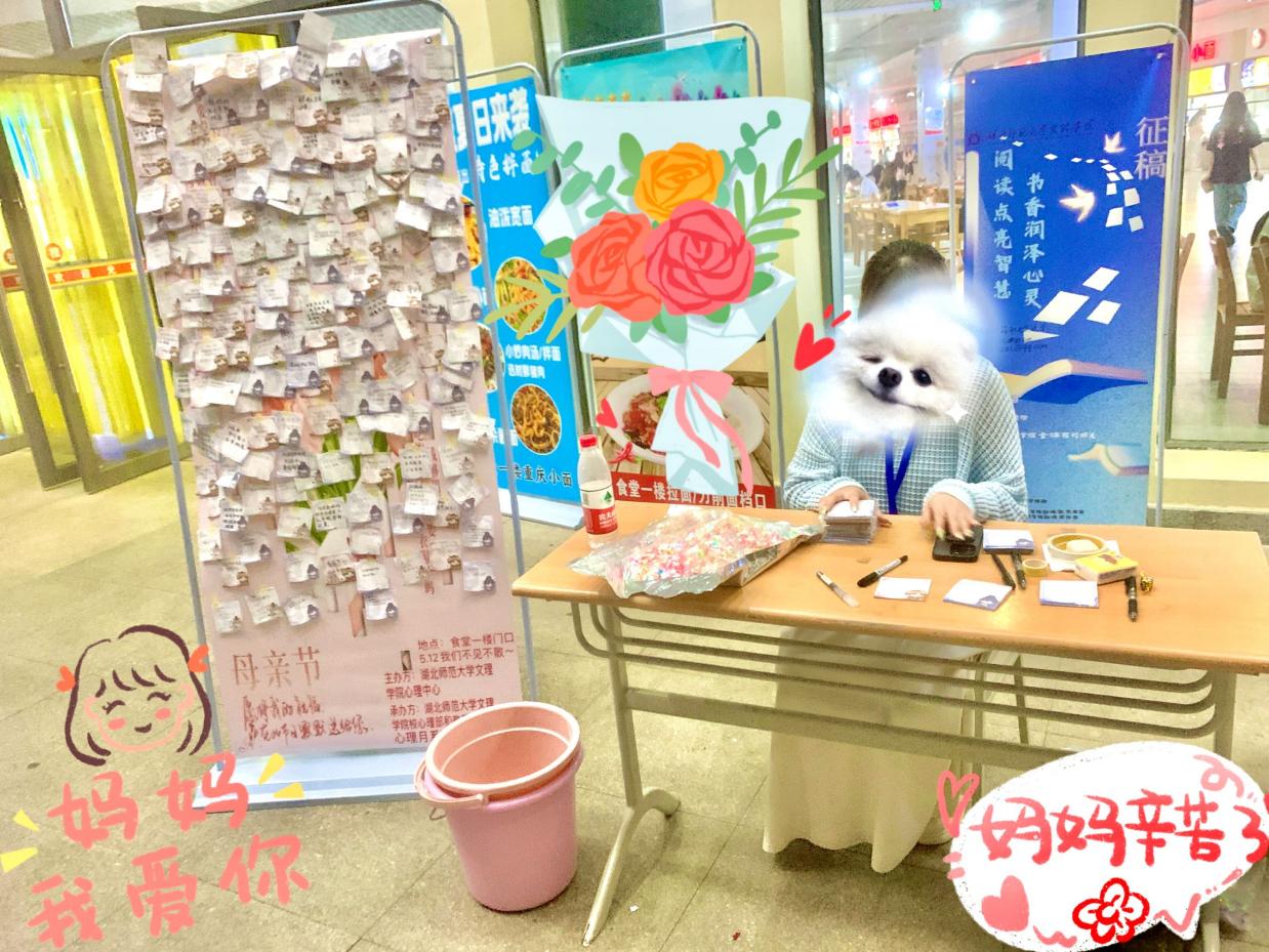本活动由虎牙网页版心理中心主办,教育与艺术学部心理部承办于2024年5月11日9:00至9:00 食堂门口一楼展开“爱没有方向,你就是导航”的母亲节活动。本次活动面向全体学部所有师生,由教育与艺术学部心理部部长、教艺学部副主席带领其部门八位干事顺利展开。