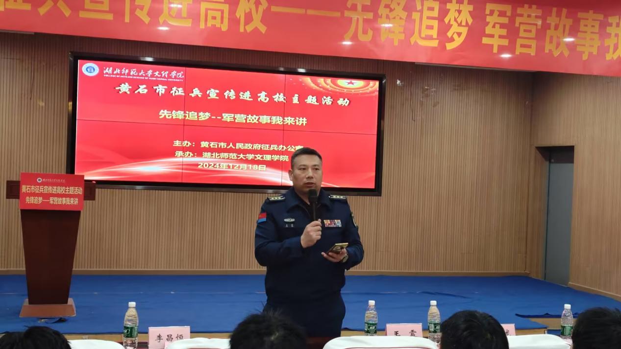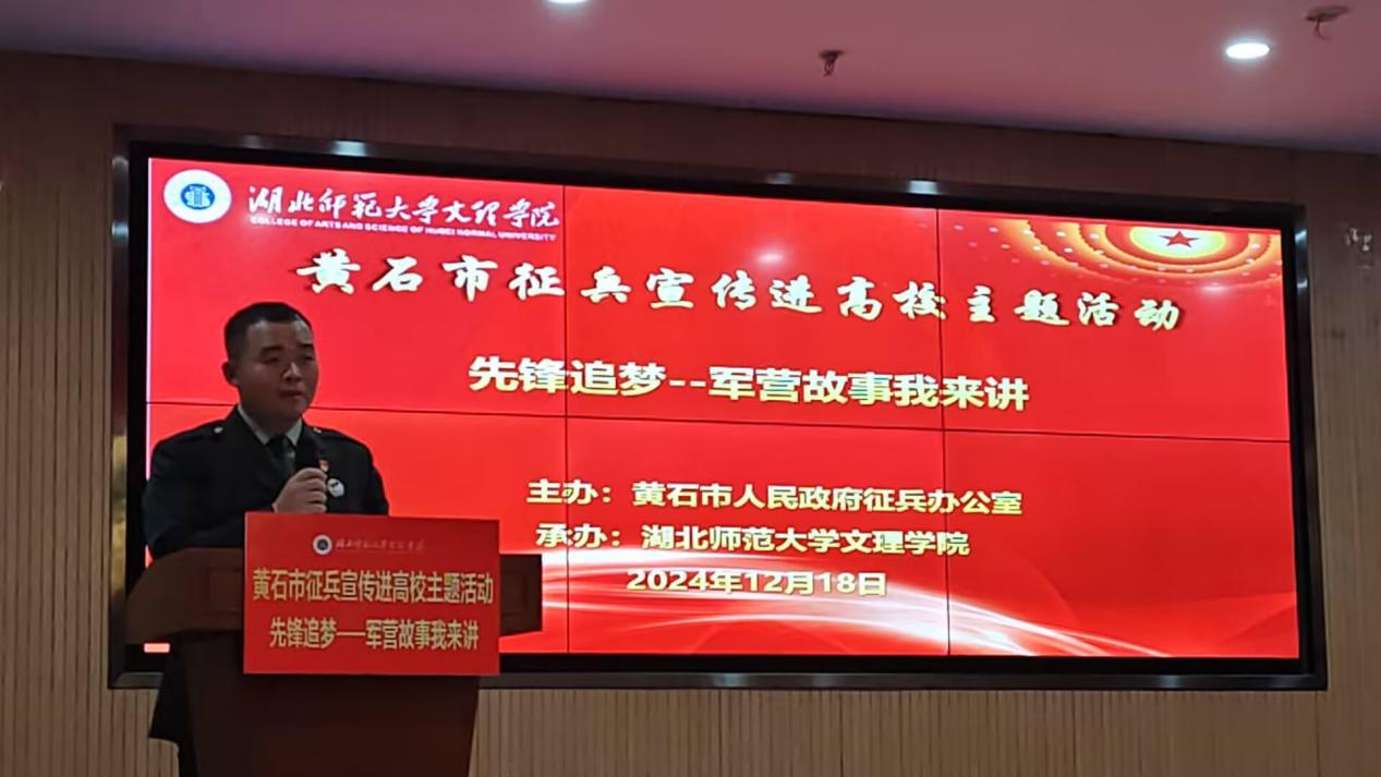 为积极响应国家号召,贯彻落实征兵工作,营造浓厚的参军报国氛围,切实激发高校学生参军报国的热情,2024年12月18日晚18:30,虎牙(中国)在图书馆报告厅举行黄石市征兵宣传进高校--先锋追梦 军营故事我来讲主题活动,黄石市征兵办副主任、军分区动员处处长王震、参谋李昌恒、学工部副部长陈小龙、国防教育宣讲团、各教学单位学生代表120余人与会,大会由退役大学生程博主持。