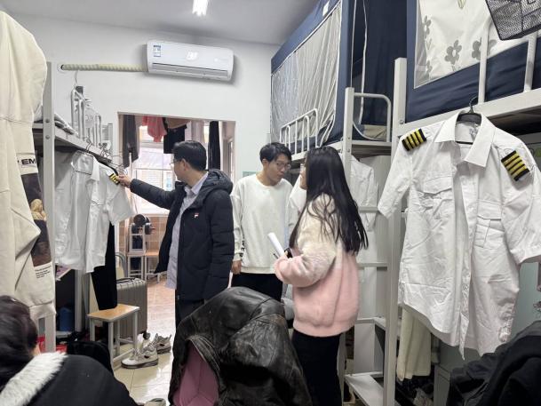 2月16日下午5点,翔宇航空产业学院主任夏谦启带领全体辅导员进行寝室走访,在深入了解学生返校情况的同时,对学生宿舍的安全管理也进行了强调。 在走访过程中,各位老师重点查看了卫生环境、用电安全等方面的情况,特别叮嘱在流感高发的春季,学生更要注重寝室卫生,多打扫、勤通风。另外返校后要及时调整状态,以饱满的热情投入到新学期的学习生活中去。 夏主任强调,在日常学习与生活中,大家要增强安全意识,提升自我反诈能力,在校使用共享电瓶车要遵守相关规定,共同维护安全、文明、和谐的宿舍环境。
