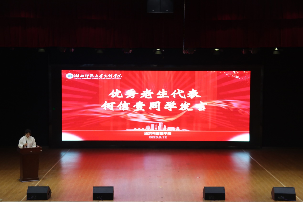 来自物流管理2301班的老生代表何信壹同学分享了自己在校期间的学习方法、实践经历与成长感悟,用真实案例为新生提供了实用的经验参考,鼓励学弟学妹们积极探索、勇于尝试。财务管理2501班的季婉晶作为优秀新生代表发言,她表达了对大学生活的憧憬与期待,并代表全体新生承诺将以饱满的热情投入学习,不负学院期望,努力成为优秀的经管学子。