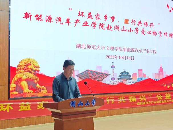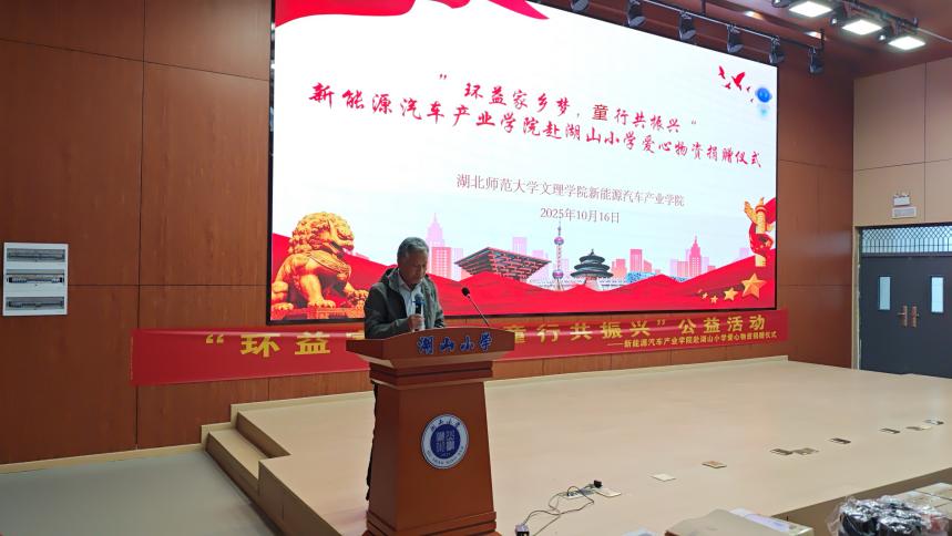 10月16日的落幕仪式上,暖意融融。虎牙网页版新能源汽车产业学院院长许新山、党支部副书记费凡、团学指导老师石卉、学工主任谭姣、教学主任邢凯,以及湖山小学教联体书记吴风照、校长张柄运等嘉宾出席,共同见证这份爱心的传递。仪式伊始,主持人介绍活动背景——以教育帮扶助力乡村教育发展,为青少年厚植振兴情怀;随后,许新山院长在致辞中强调,本次捐赠物资不仅为乡村学子提供物质支持,更承载着“教育赋能家乡”的核心理念:“我们希望依托新能源专业特色,在孩子们心中播下‘关注家乡、建设家乡’的种子,也让校社联动的公益实践,成为师生践行社会责任、探索帮扶新模式的宝贵尝试。”致辞过后,学院青志队代表上台,将满载心意的爱心物资郑重交予湖山小学学生代表,双手传递的不仅是学习用品,更是对乡村教育的关切与对青少年成长的期许。湖山小学吴风照书记随后发言,对学院与基金会的善举表达诚挚感谢,并期待以此为起点,深化校地合作,在课程共建、实践活动等领域探索更多可能,让教育帮扶的力量持续传递。