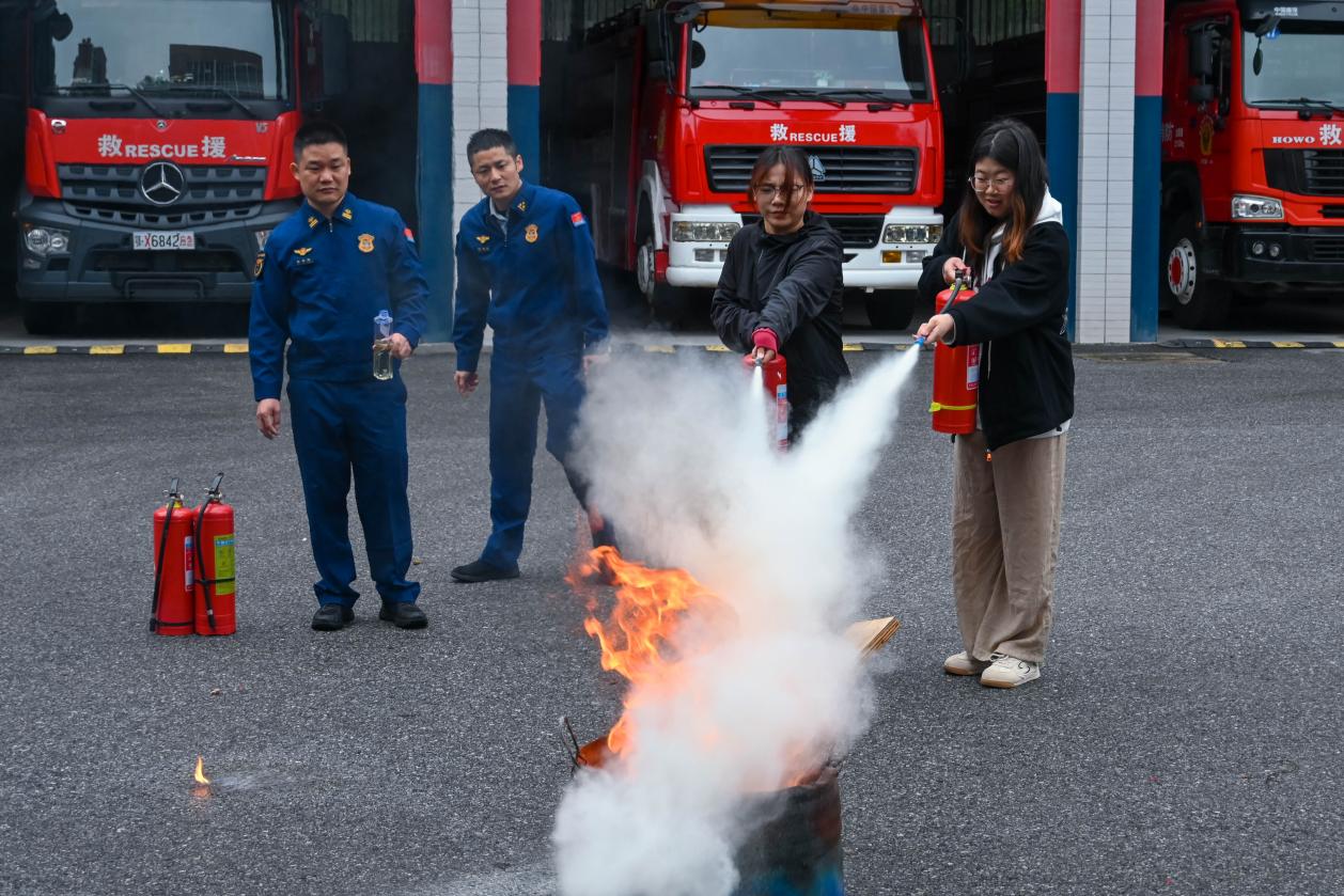 在实操环节,同学们在消防员的指导下进行了灭火器操作和消防服穿戴体验。通过实践学习,大家掌握了灭火器的正确使用方法,增强了应急处置能力。消防服体验让大家切身感受到消防员在执行任务时面临的困难与风险,进一步认识到“人民至上、生命至上”的工作理念。