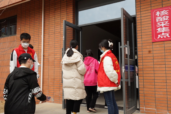 核酸检测场地设在二号实验楼一楼,检测现场严格落实疫情防控要求,全体师生戴口罩间隔1米,分时段、分批次,陆续进入等候区。检测前,受检人员提前登录“湖北健康码”,经现场检查扫码验证后,由来自专业医务人员对师生进行咽拭子采集。由各学部组织的志愿者在现场协助开展信息录入、秩序维护等核酸采样志愿服务工作,全体人员积极配合、秩序井然,检测流程从采样到离场,组织科学、保障有力、防护到位。