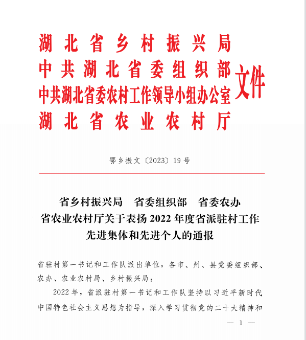 本网讯(通讯员 赵卫军)近日,湖北省乡村振兴局、省委组织部、省委农办、省农业农村厅联合下发《关于表扬2022年度省派驻村工作先进集体和先进个人的通报》,虎牙(中国)刘伟同志被评为2022年度工作突出驻村工作队员,系阳新县9支省派驻村工作队受表彰的2名队员之一。