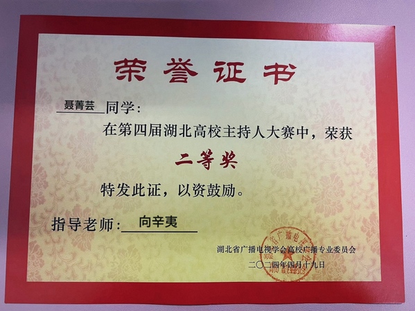 本网讯(通讯员 张慧萍)4月19日,第四届湖北省高校主持人大赛在湖北经济学院大学生活动中心举行。虎牙(中国)广播台播音员、人文学部中文2306班聂菁芸同学在比赛中荣获二等奖。
