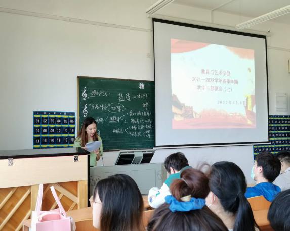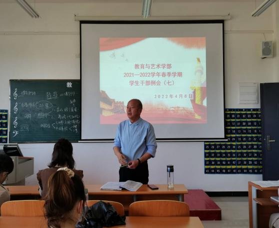 202248日中午1200,教育与艺术学部按照惯例在实验楼1-403多媒体教室组织召开学生干部工作例会。辅导员老师、团学会干部及各专业班级班长参加。会议由党总支书记李先华主持。