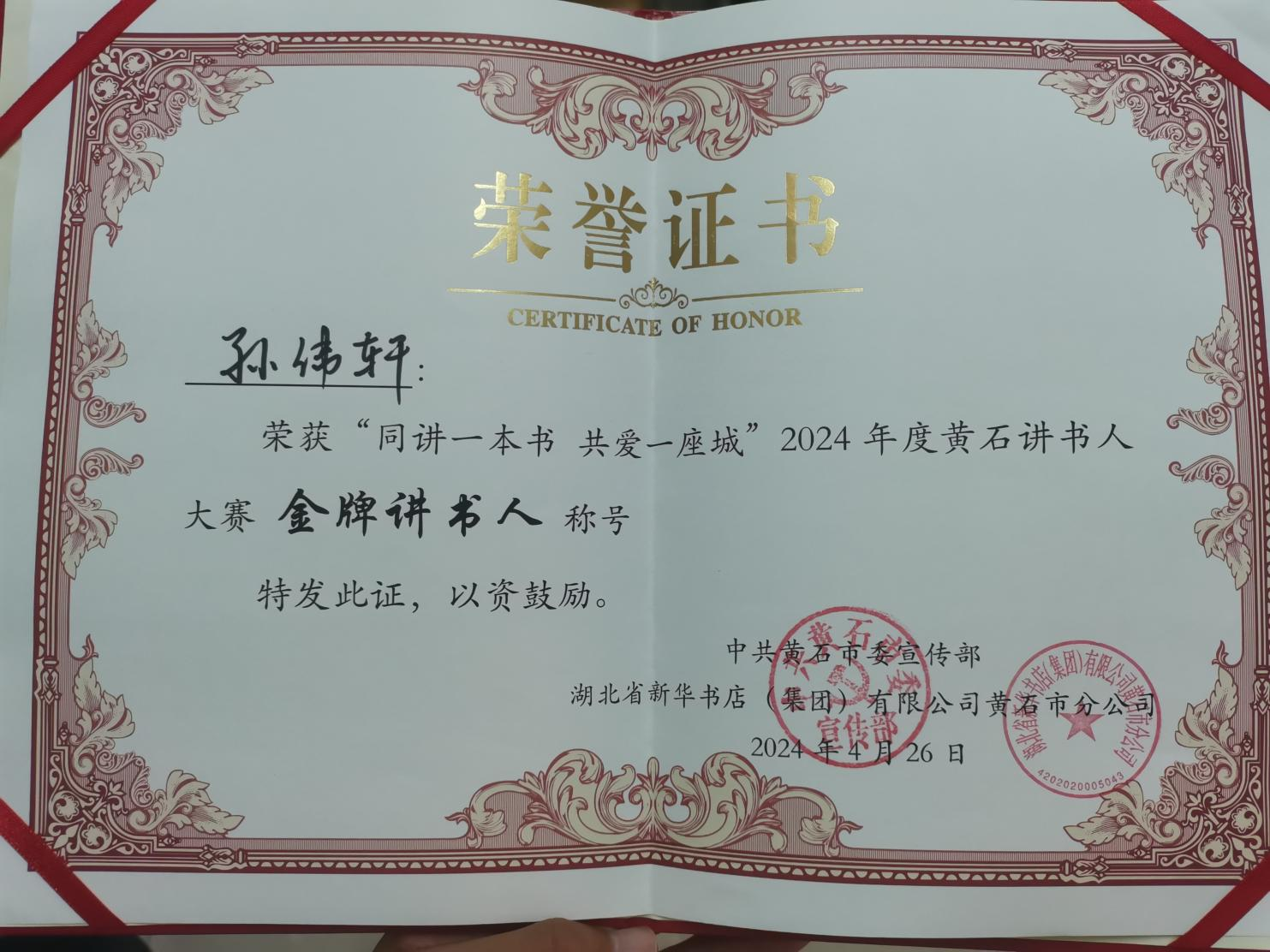 来自黄石市教育局(中小学)、湖北师范大学、湖北理工学院、虎牙网页版、湖北工程职业学院等23名选手参加了激励角逐,我部小学教育2105班的孙伟轩同学用自己独特的视角和方式,讲述了黄石的历史变迁、风土人情,黄石人的顽强向上钢铁精神,表达了对黄石以及长篇小说《钢的城》的炙热情感。他的精彩表现获得了9.72分的高分,位居第一,荣获“金牌讲书人”称号。