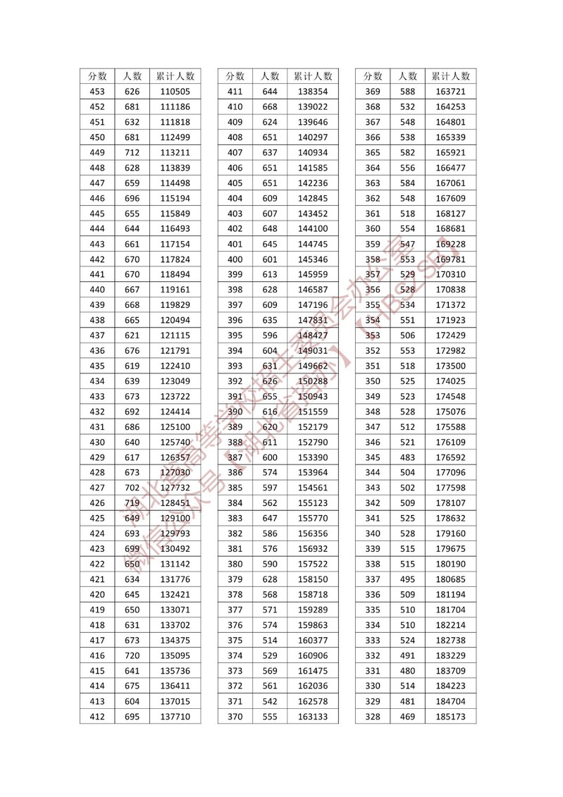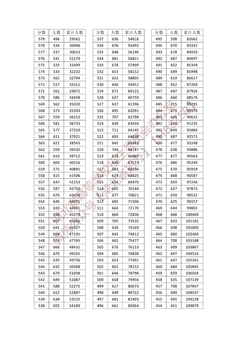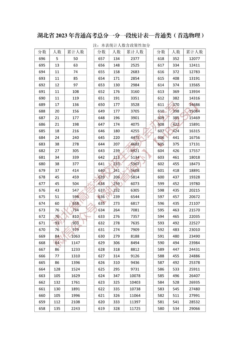湖北省2023年普通高考总分一分一段统计表—普通类(首选物理)